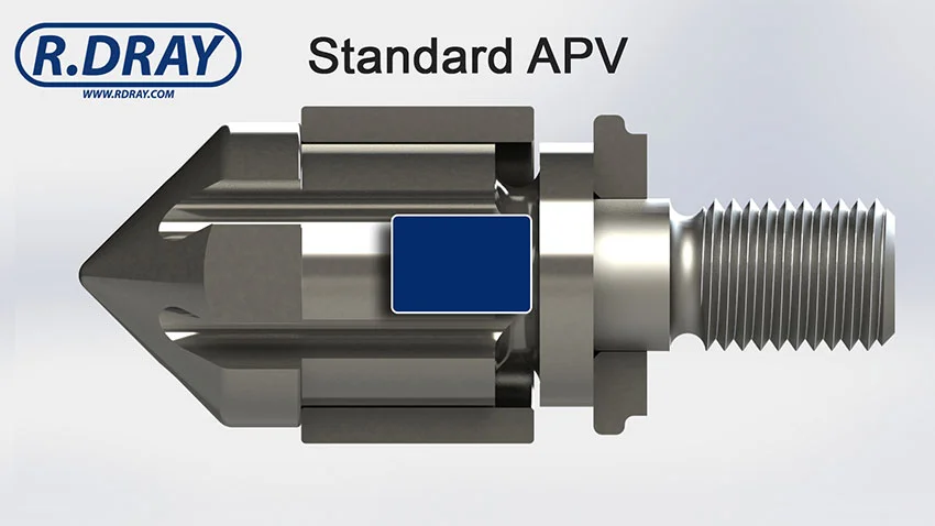 Traditional rear seat closing screw tips are prone to leakage and excessive wear on equipment which naturally leads to cushion variation, part weight variation, and unnecessary maintenance costs. The APV (pat. 6203311 & 6464488) was created to have a self cleaning screw tip design that provides shot-to-shot repeatability and accuracy, regardless of initial velocity, without excessive barrel wear.